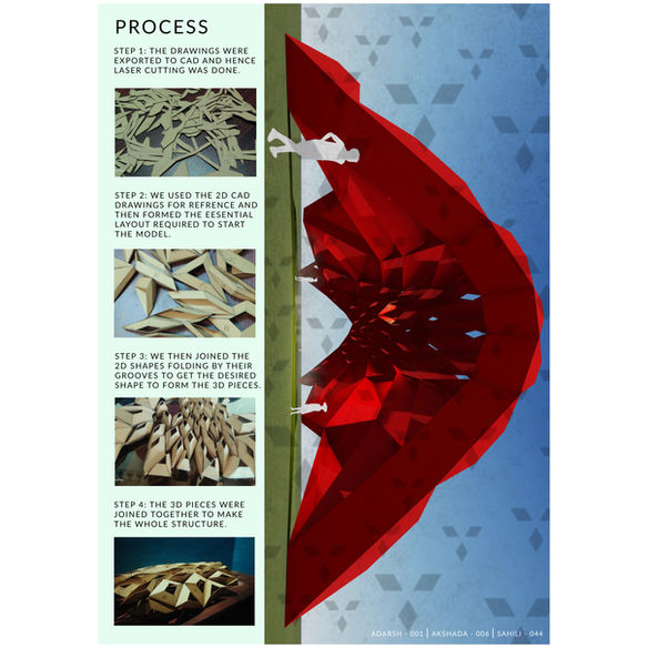 The students used plugins like KANGAROO - Planarization, LUNCHBOX - Tessellation, and lastly OPEN NEST - to get the 2d file for fabrication. Each model is roughly about 50cm x 30cm x 20cm. The cost of each model was about Rs. 450 or 6.15 USD, if the same models were to be 3d printed it would have cost around Rs. 4000 or 54.5 USD. Huge savings by doing the process of planarization and opting for laser cutting.